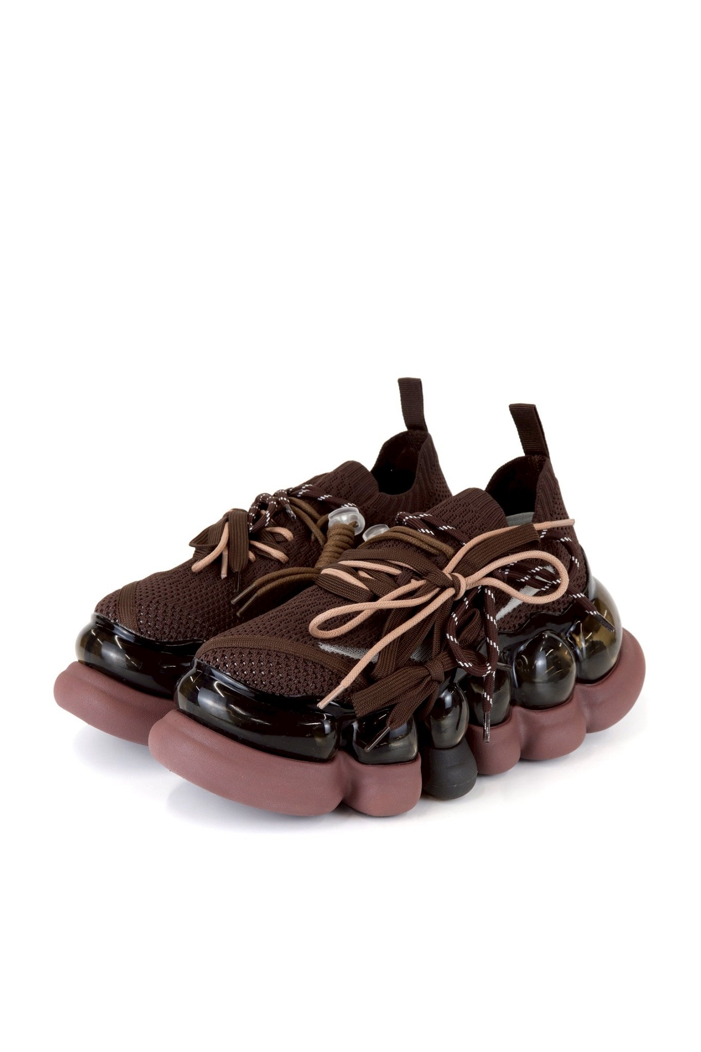These shoes feature a knit upper with a mesh design on the sides and three types of shoelaces.