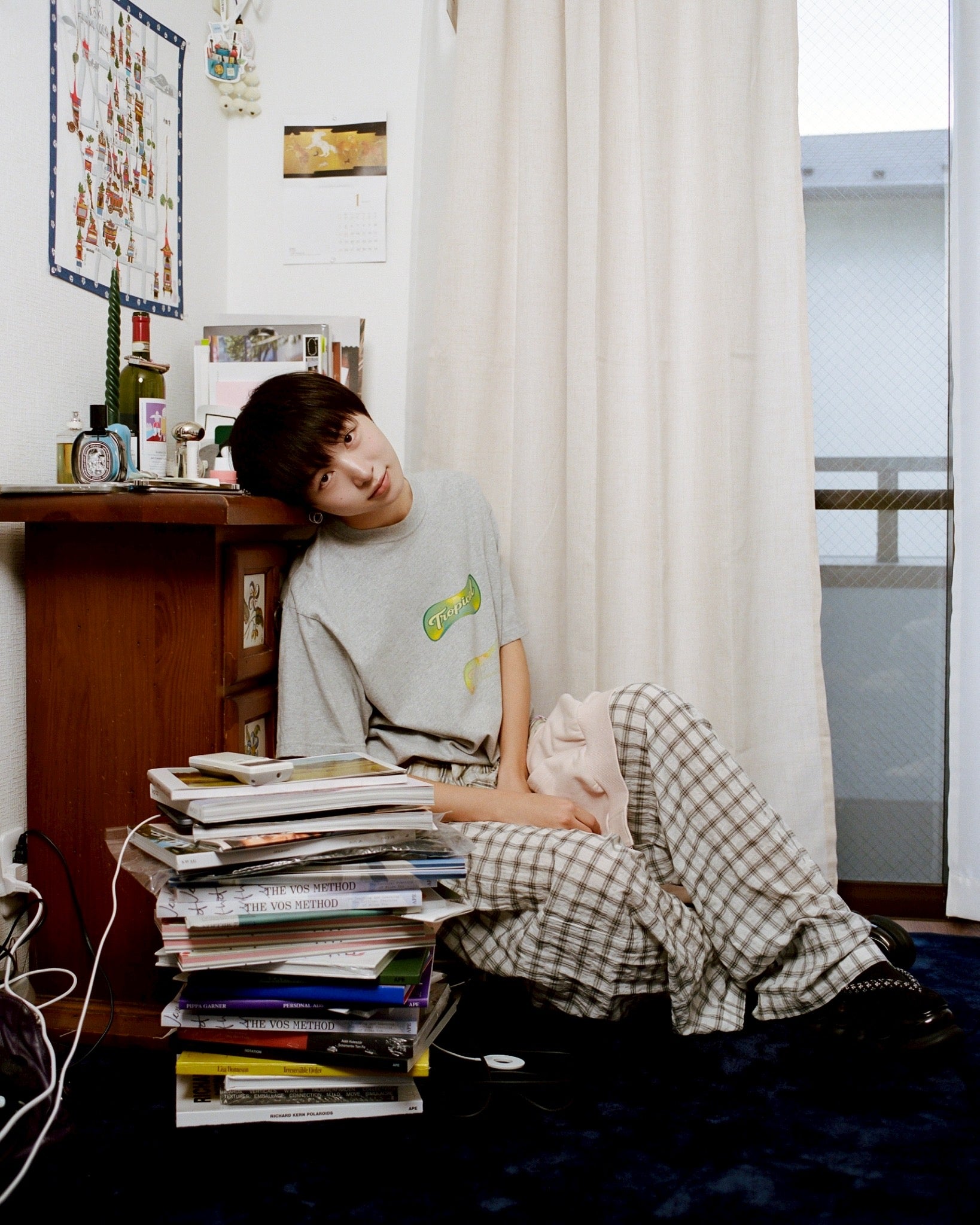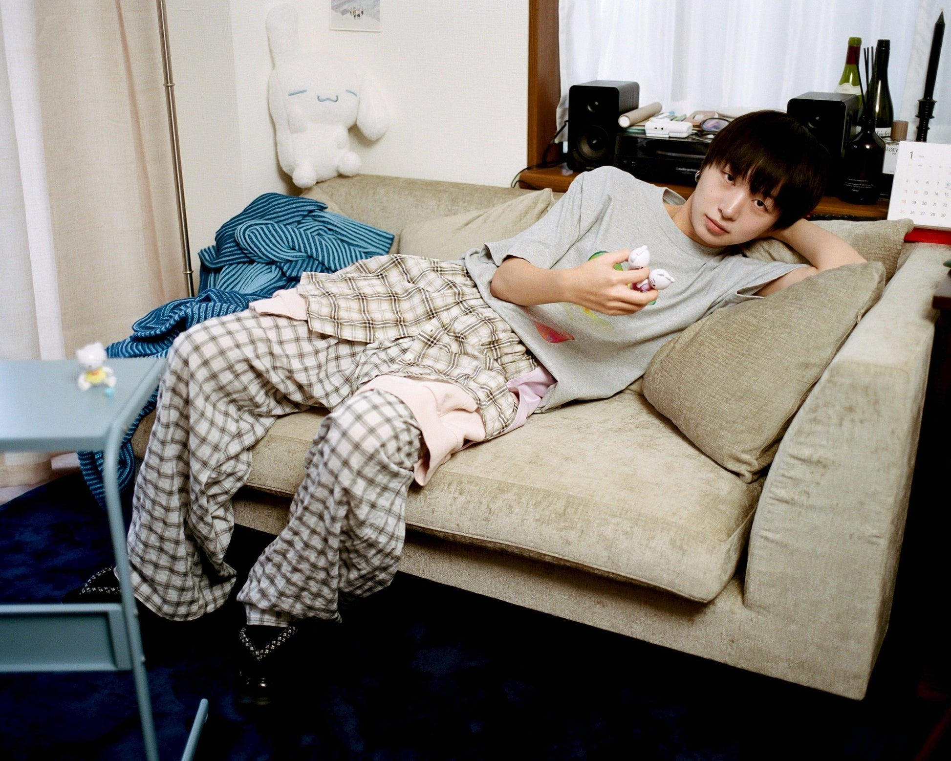 Tシャツ、パーカー、チェックシャツの裾がドッキングされたレイヤード風のパンツ。
