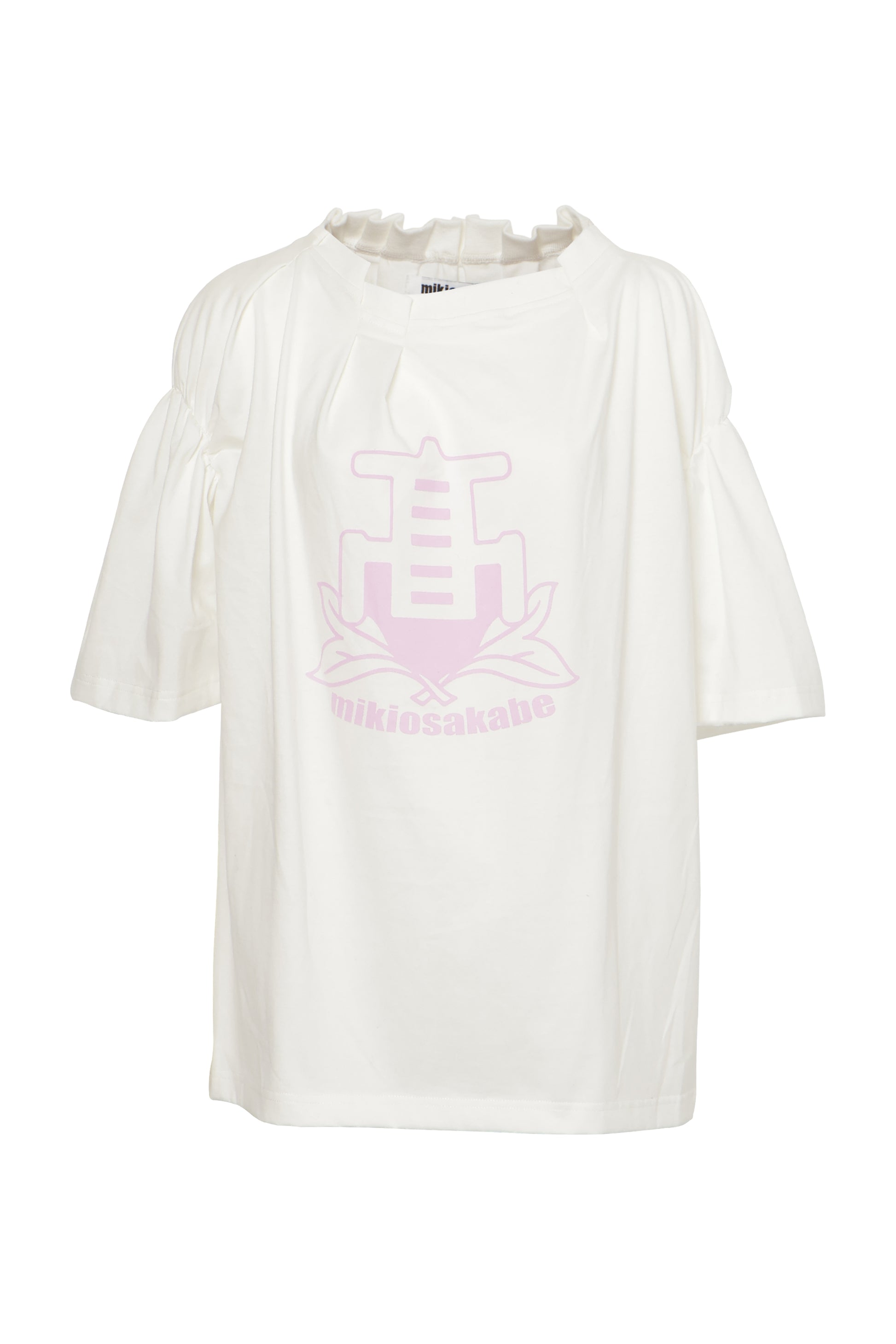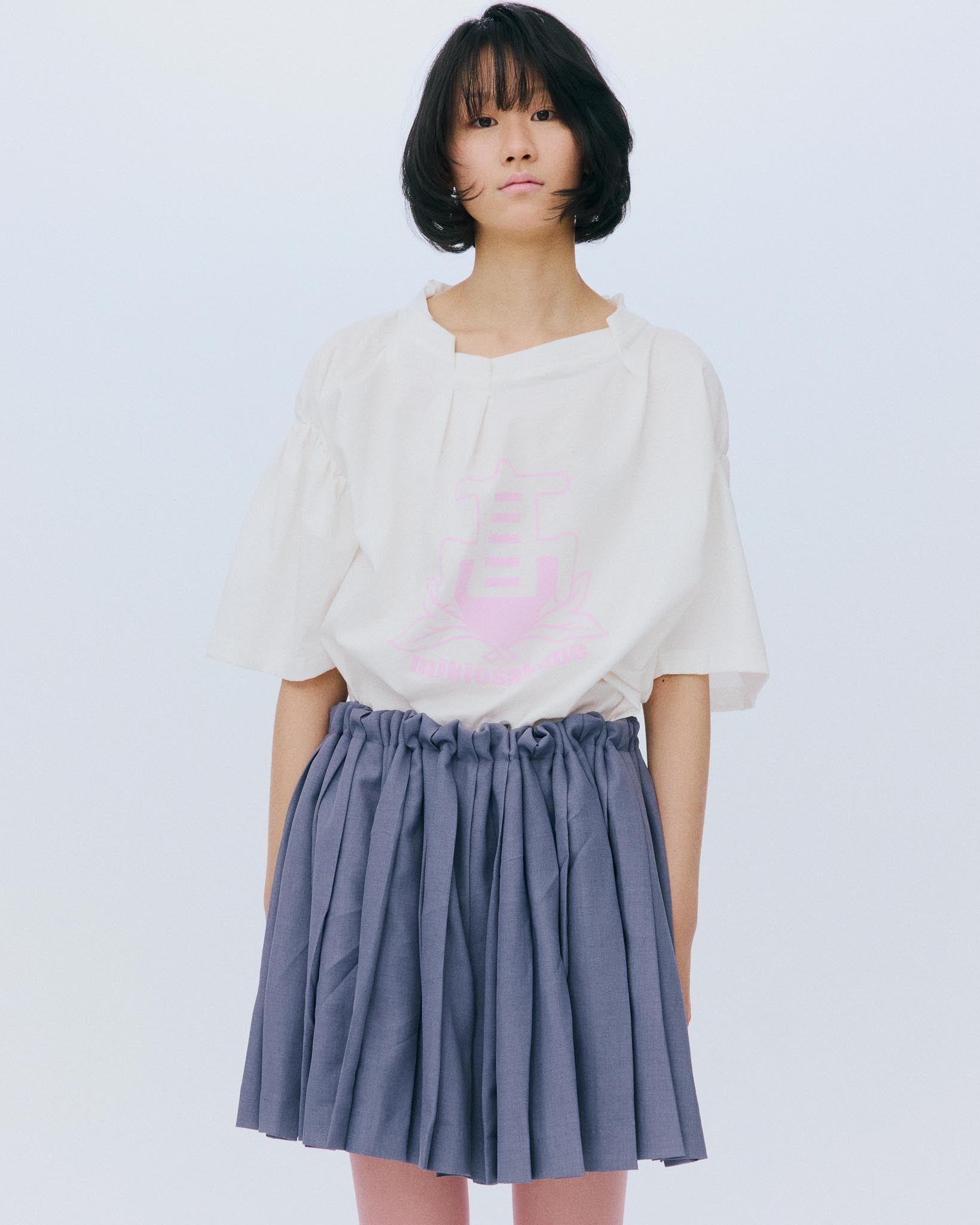 センターにはスクールエンブレム風のプリント、襟ぐりやアームホールにはランダムなタックが表情を添えています。