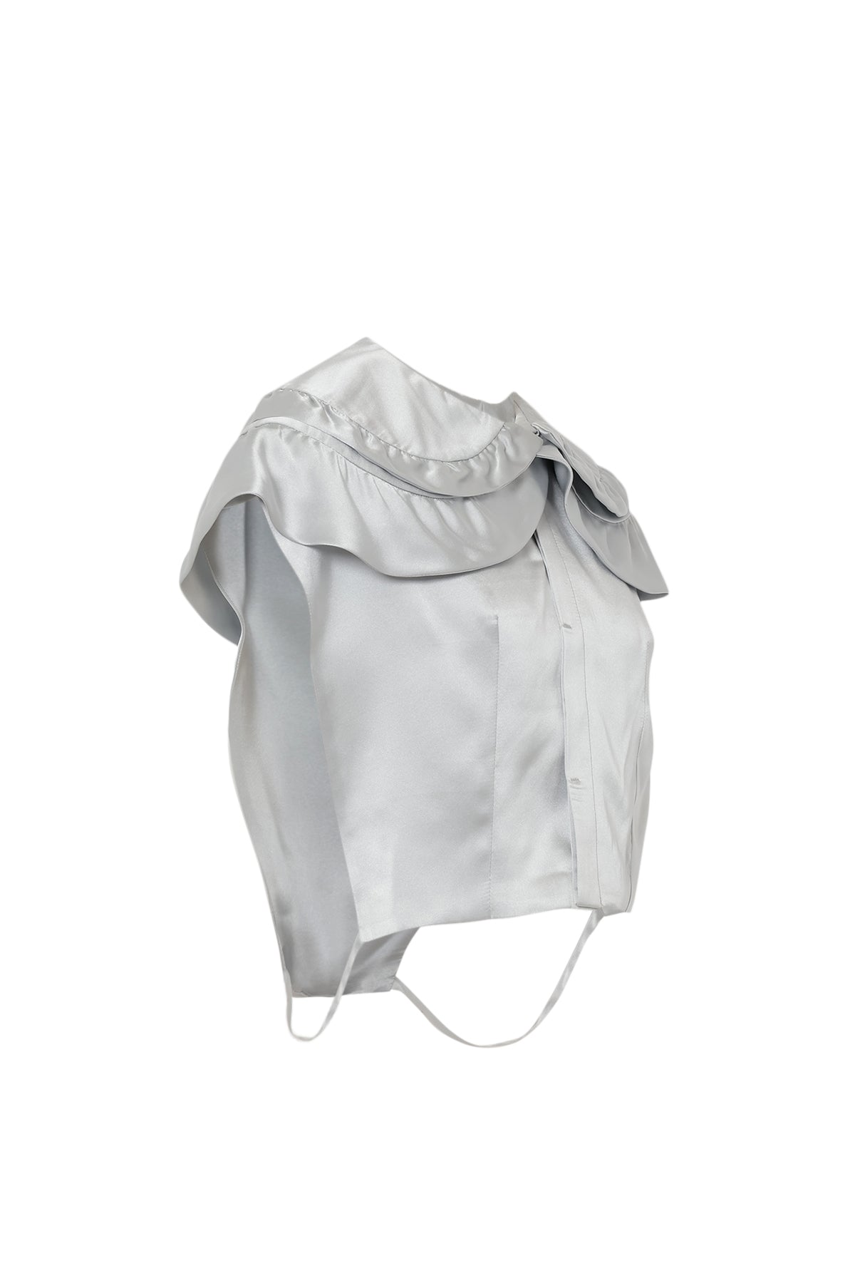 大きな襟2枚重なっているのが特徴のベスト。襟元のラッフルがcute。上品な光沢のある生地を使用。