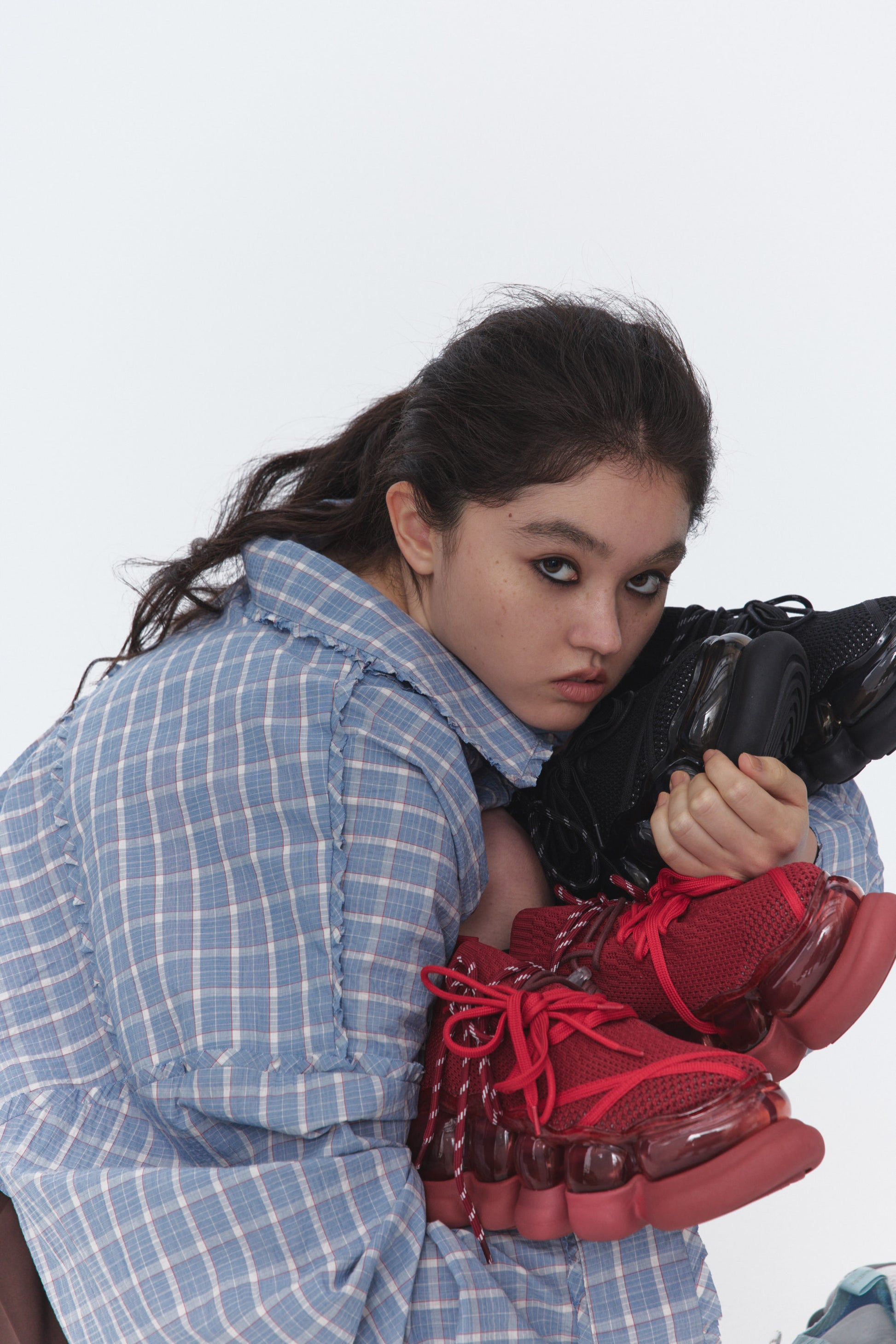 鞋头处的缝线和鞋跟处的装饰性鞋带突出了不对称的设计。