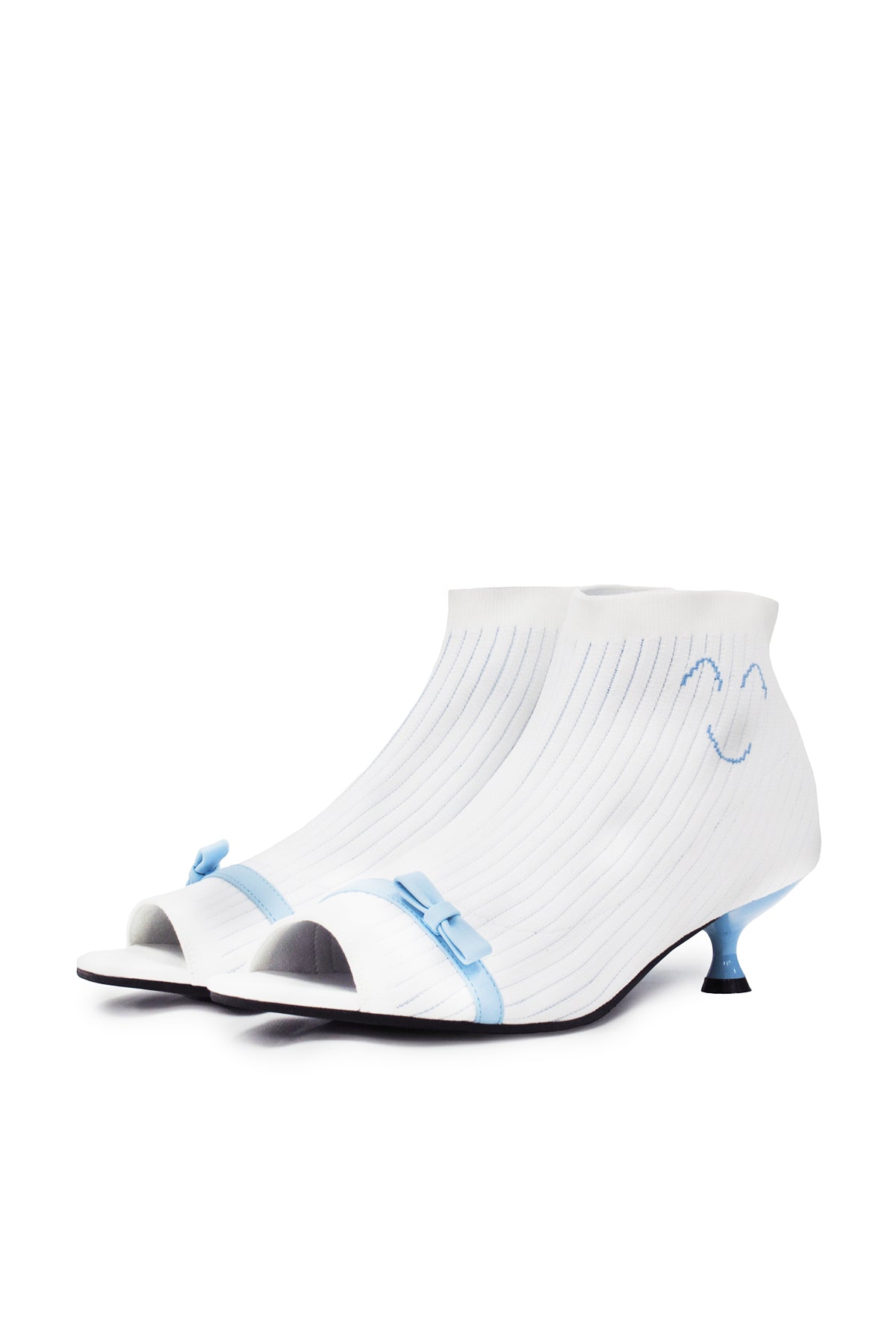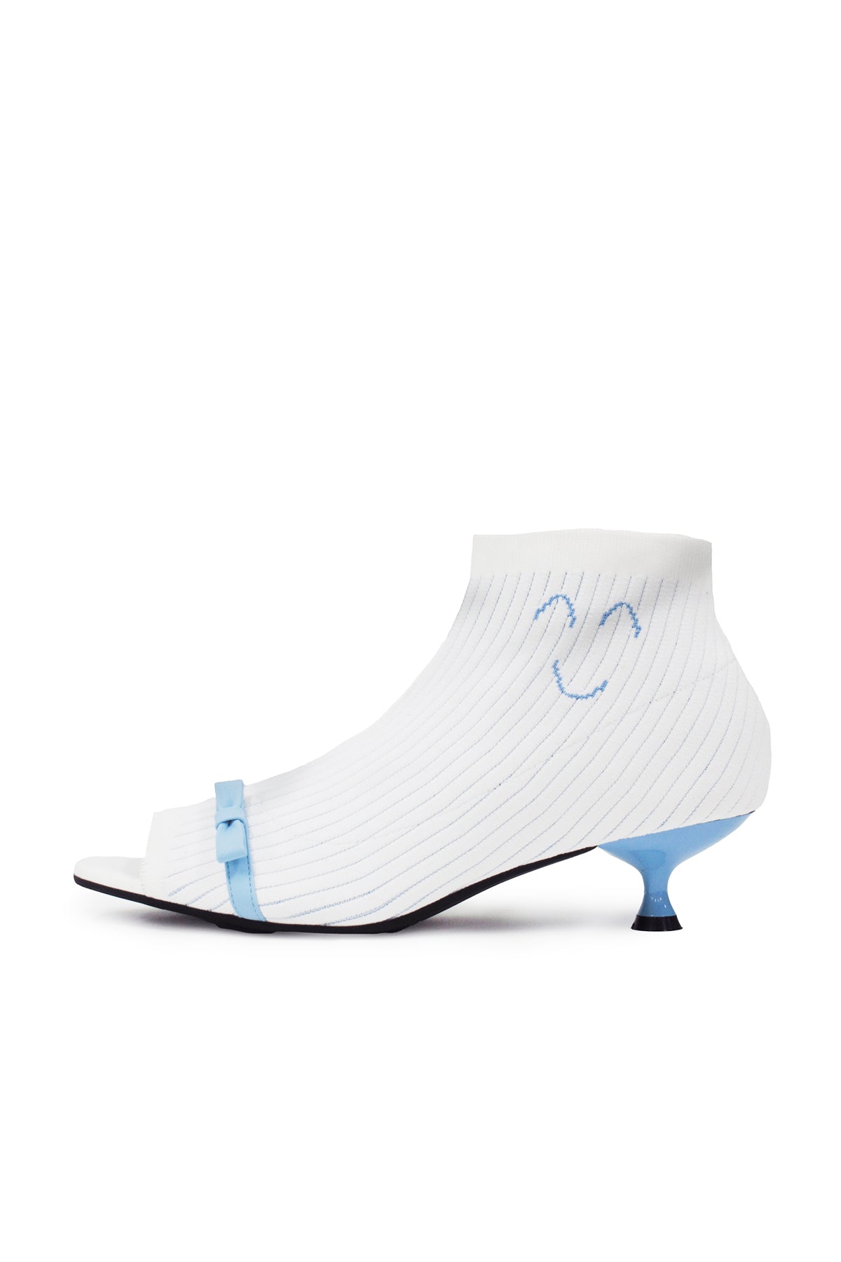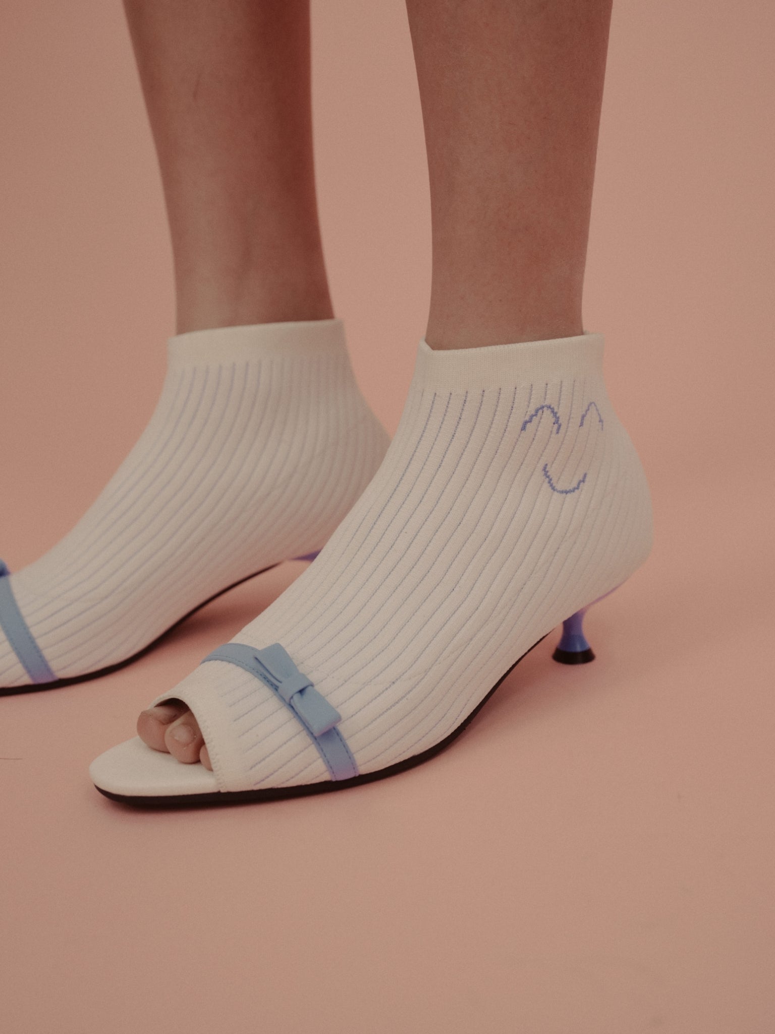 高跟靴充满复古气息。正面可爱的丝带细节和宽松的刺绣笑脸是亮点。